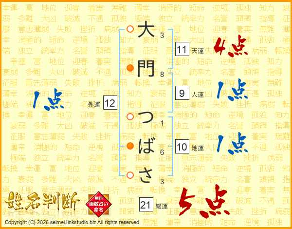 大門つばささんの総運は21画の5点!