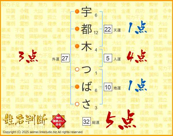 宇(6画)都(12画)木(4画) つ(1画)ば(6画)さ(3画)