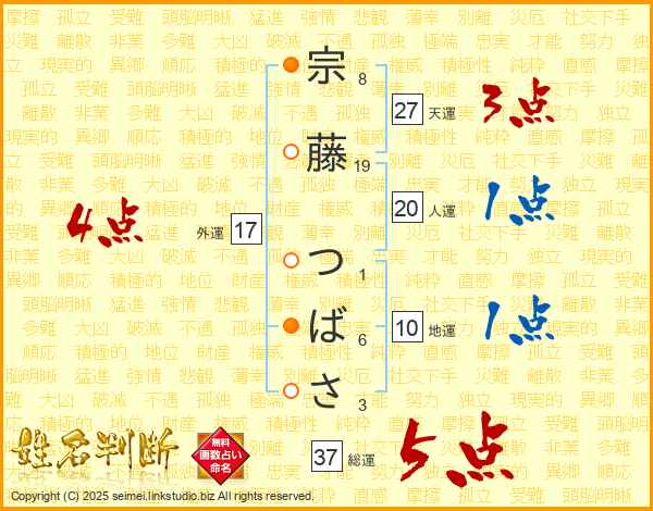 生活面を象徴する運勢です。外部から受ける影響力を表し、結婚運、家庭運や職場、環境への順応性を表します。総運から人運を引いた画数。姓や名が1文字の場合を除く。