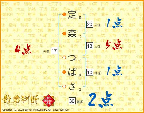 生活面を象徴する運勢です。外部から受ける影響力を表し、結婚運、家庭運や職場、環境への順応性を表します。総運から人運を引いた画数。姓や名が1文字の場合を除く。