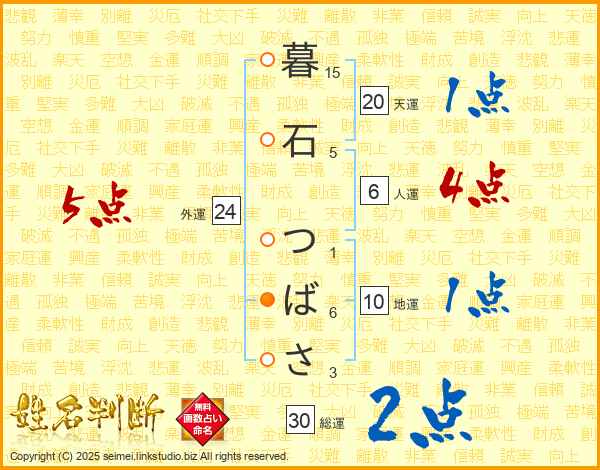 生活面を象徴する運勢です。外部から受ける影響力を表し、結婚運、家庭運や職場、環境への順応性を表します。総運から人運を引いた画数。姓や名が1文字の場合を除く。