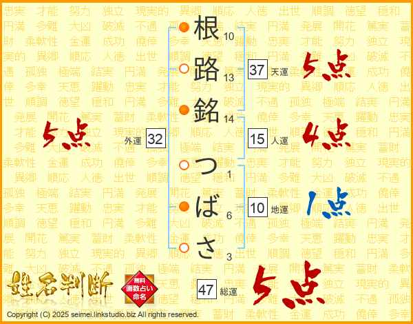 根(10画)路(13画)銘(14画) つ(1画)ば(6画)さ(3画)