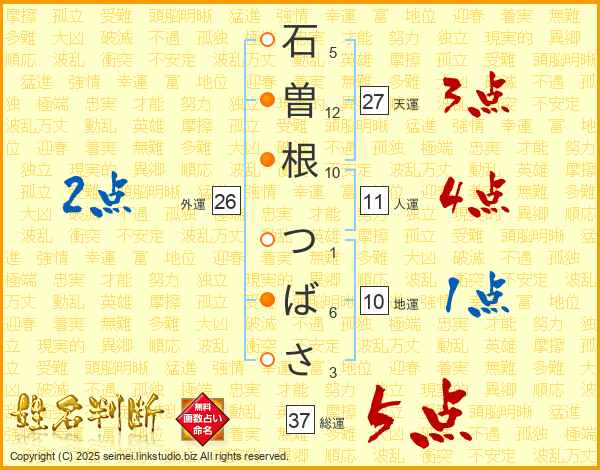 石(5画)曽(12画)根(10画) つ(1画)ば(6画)さ(3画)