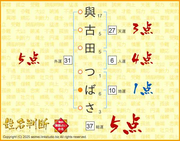 與(17画)古(5画)田(5画) つ(1画)ば(6画)さ(3画)
