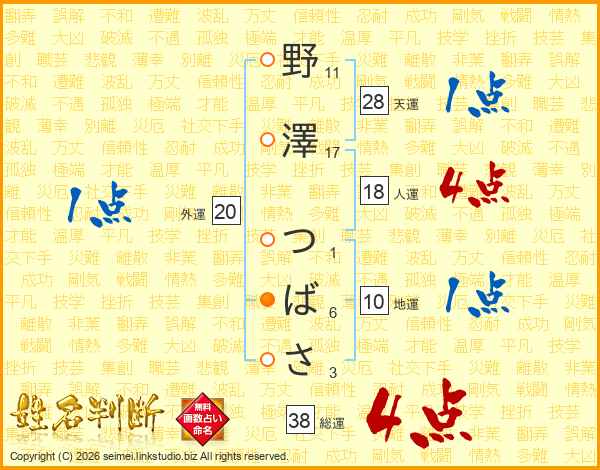 野澤つばささんの総運は38画の4点!