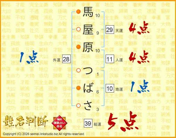 馬屋原つばささんの総運は39画の5点!