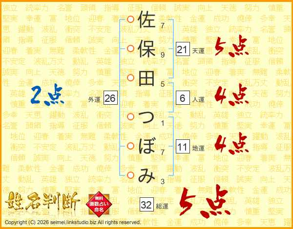 生活面を象徴する運勢です。外部から受ける影響力を表し、結婚運、家庭運や職場、環境への順応性を表します。総運から人運を引いた画数。姓や名が1文字の場合を除く。