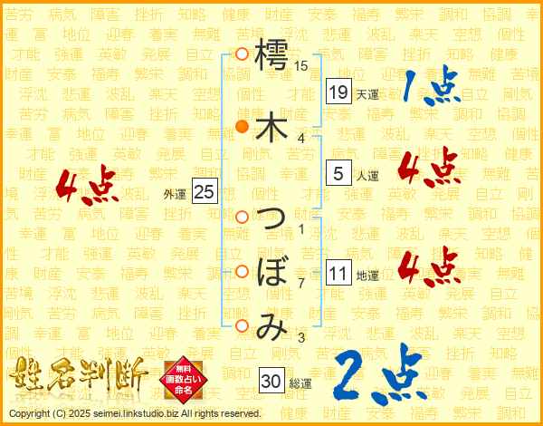 樗(15画)木(4画) つ(1画)ぼ(7画)み(3画)