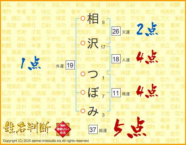 相(9画)沢(17画) つ(1画)ぼ(7画)み(3画)