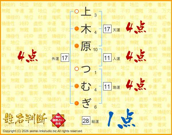 生活面を象徴する運勢です。外部から受ける影響力を表し、結婚運、家庭運や職場、環境への順応性を表します。総運から人運を引いた画数。姓や名が1文字の場合を除く。