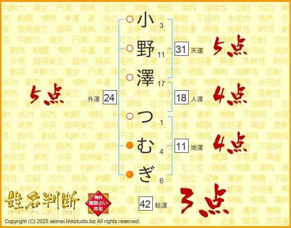 小野澤つむぎさんの外運は24画の5点!