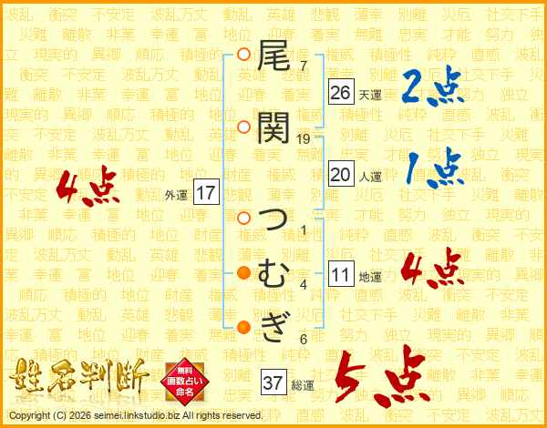 尾関つむぎさんの総運は37画の5点!
