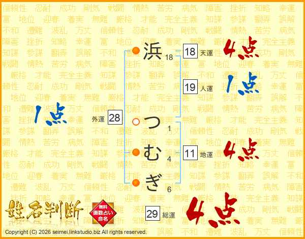 浜(18画) つ(1画)む(4画)ぎ(6画)