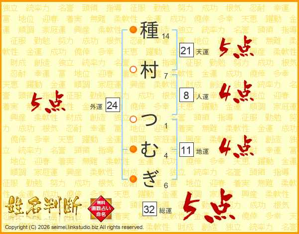 種(14画)村(7画) つ(1画)む(4画)ぎ(6画)
