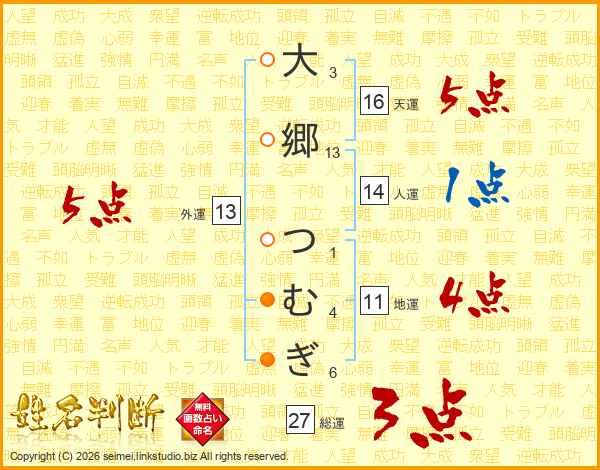 大(3画)郷(13画) つ(1画)む(4画)ぎ(6画)