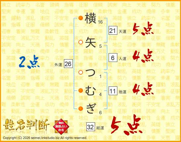 横矢つむぎさんの天運は21画の5点!
