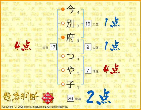 今(4画)別(7画)府(8画) つ(1画)や(3画)子(3画)