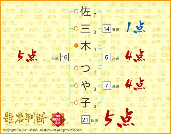 佐(7画)三(3画)木(4画) つ(1画)や(3画)子(3画)