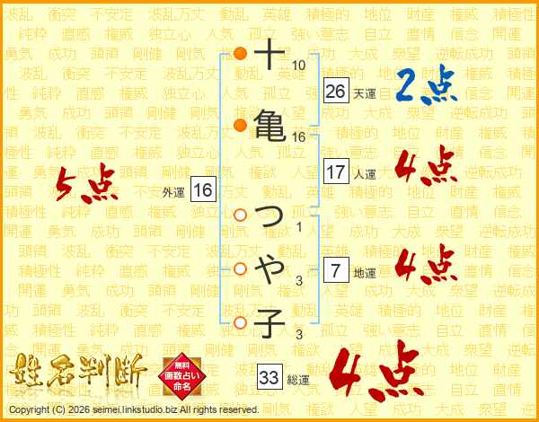 十(10画)亀(16画) つ(1画)や(3画)子(3画)