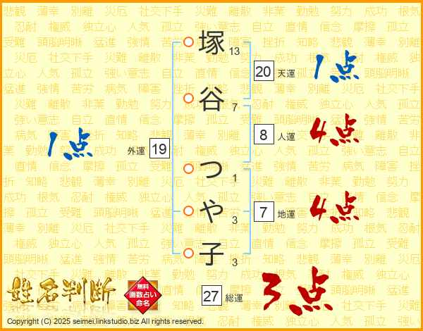 塚(13画)谷(7画) つ(1画)や(3画)子(3画)
