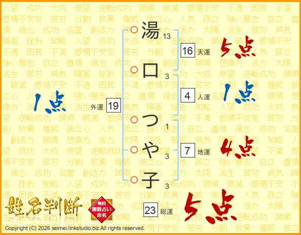 湯口つや子さんの総運は23画の5点!