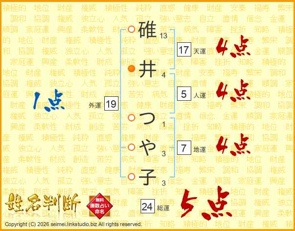 碓(13画)井(4画) つ(1画)や(3画)子(3画)