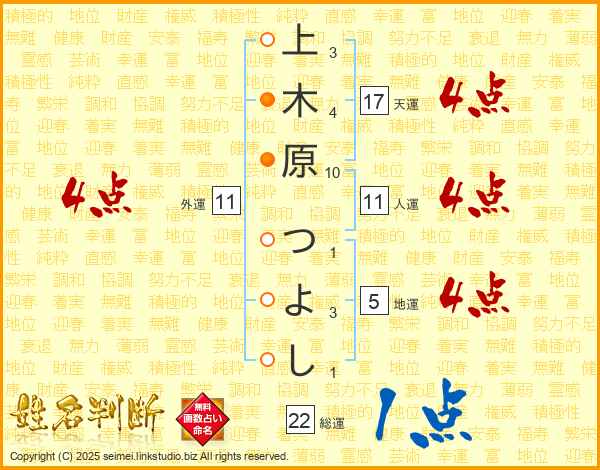 生活面を象徴する運勢です。外部から受ける影響力を表し、結婚運、家庭運や職場、環境への順応性を表します。総運から人運を引いた画数。姓や名が1文字の場合を除く。