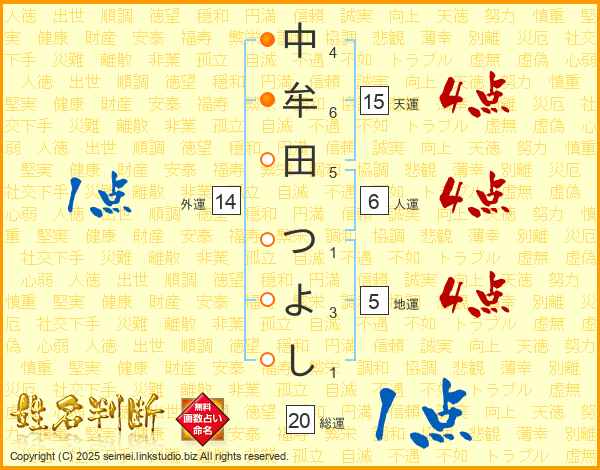 生活面を象徴する運勢です。外部から受ける影響力を表し、結婚運、家庭運や職場、環境への順応性を表します。総運から人運を引いた画数。姓や名が1文字の場合を除く。