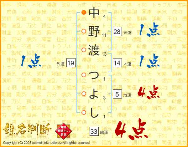 中(4画)野(11画)渡(13画) つ(1画)よ(3画)し(1画)
