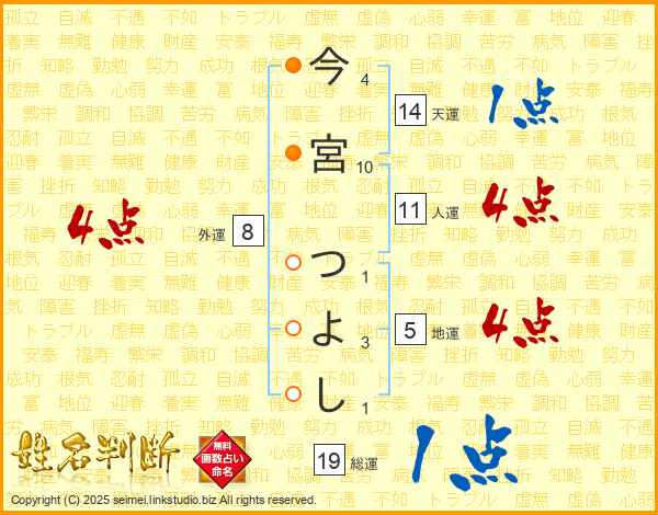 今(4画)宮(10画) つ(1画)よ(3画)し(1画)