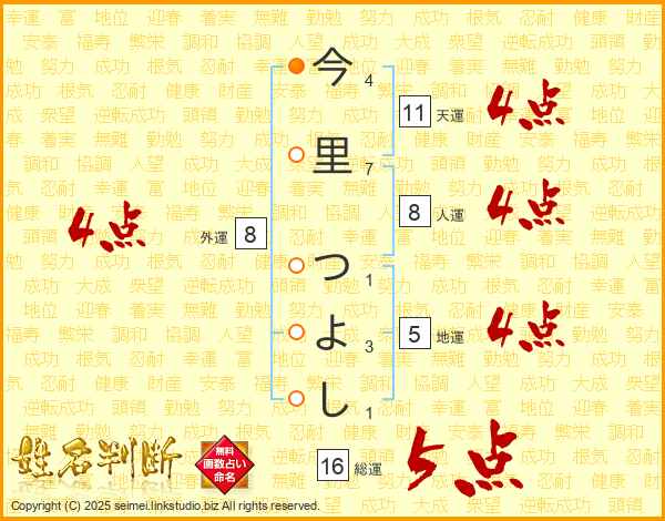 今(4画)里(7画) つ(1画)よ(3画)し(1画)