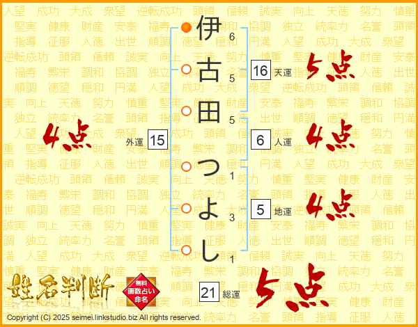 伊古田つよしさんの総運は21画の5点!
