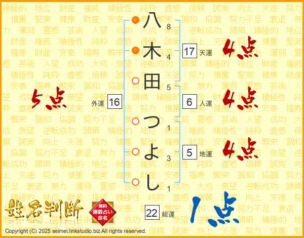生活面を象徴する運勢です。外部から受ける影響力を表し、結婚運、家庭運や職場、環境への順応性を表します。総運から人運を引いた画数。姓や名が1文字の場合を除く。