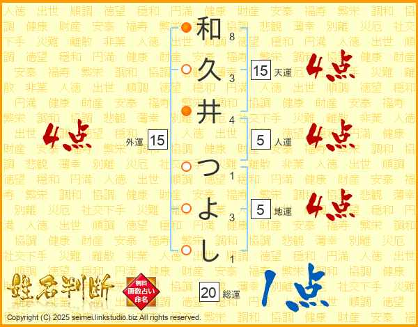 生活面を象徴する運勢です。外部から受ける影響力を表し、結婚運、家庭運や職場、環境への順応性を表します。総運から人運を引いた画数。姓や名が1文字の場合を除く。