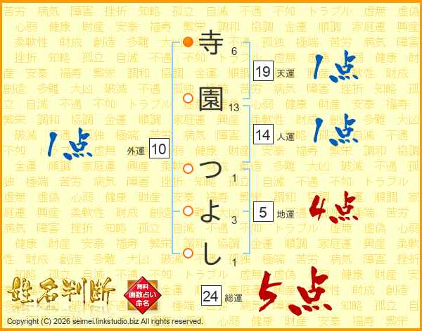生活面を象徴する運勢です。外部から受ける影響力を表し、結婚運、家庭運や職場、環境への順応性を表します。総運から人運を引いた画数。姓や名が1文字の場合を除く。