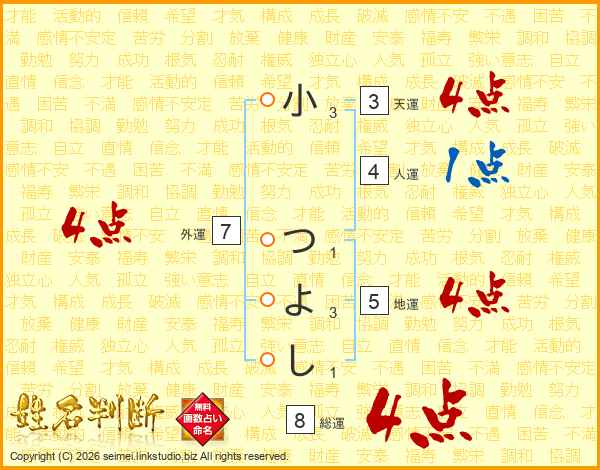 生活面を象徴する運勢です。外部から受ける影響力を表し、結婚運、家庭運や職場、環境への順応性を表します。総運から人運を引いた画数。姓や名が1文字の場合を除く。