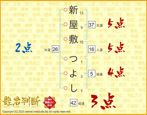 新(13画)屋(9画)敷(15画) つ(1画)よ(3画)し(1画)