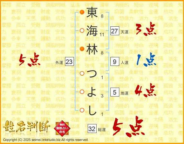 東(8画)海(11画)林(8画) つ(1画)よ(3画)し(1画)