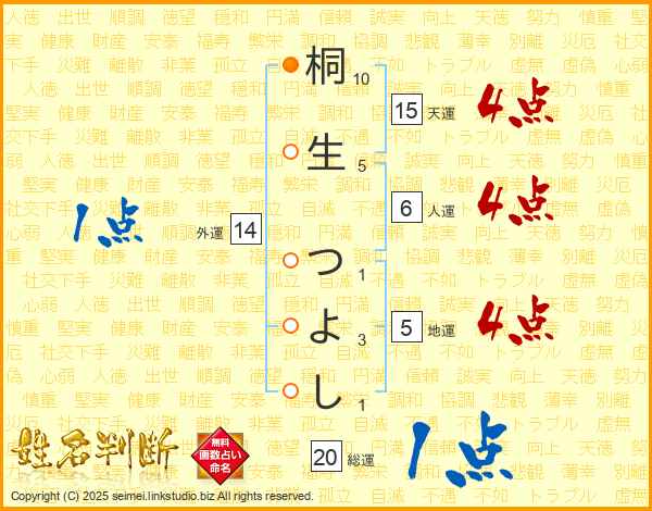 桐(10画)生(5画) つ(1画)よ(3画)し(1画)