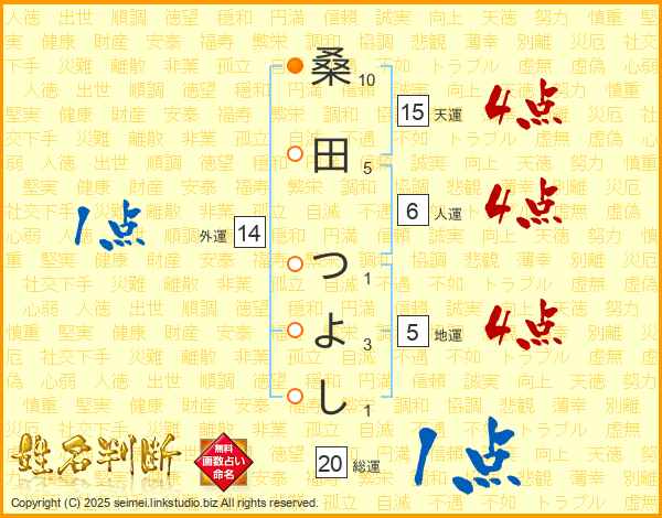 生活面を象徴する運勢です。外部から受ける影響力を表し、結婚運、家庭運や職場、環境への順応性を表します。総運から人運を引いた画数。姓や名が1文字の場合を除く。