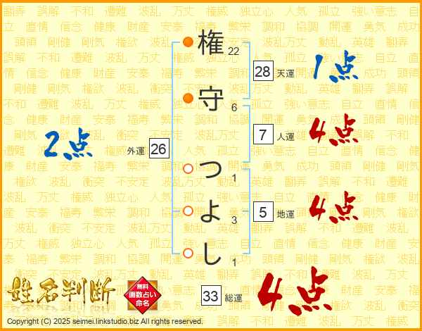 権(22画)守(6画) つ(1画)よ(3画)し(1画)