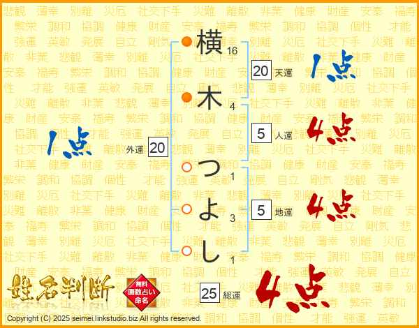 生活面を象徴する運勢です。外部から受ける影響力を表し、結婚運、家庭運や職場、環境への順応性を表します。総運から人運を引いた画数。姓や名が1文字の場合を除く。