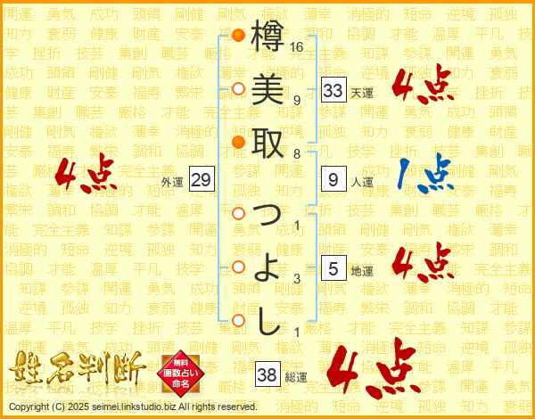 生活面を象徴する運勢です。外部から受ける影響力を表し、結婚運、家庭運や職場、環境への順応性を表します。総運から人運を引いた画数。姓や名が1文字の場合を除く。