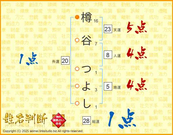 樽(16画)谷(7画) つ(1画)よ(3画)し(1画)