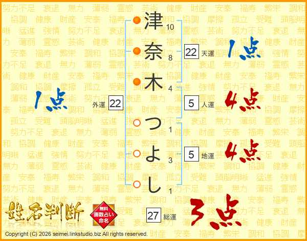 津(10画)奈(8画)木(4画) つ(1画)よ(3画)し(1画)