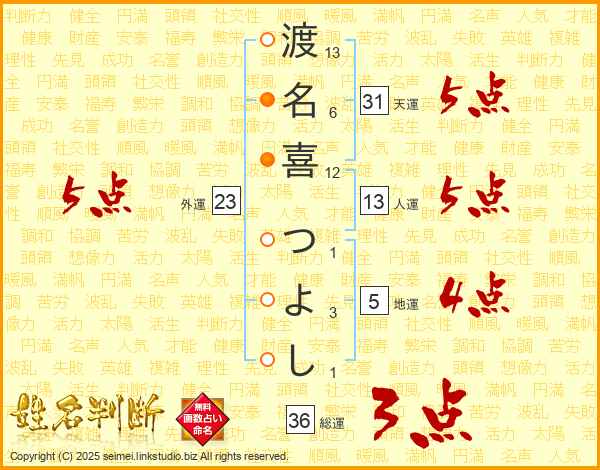 渡(13画)名(6画)喜(12画) つ(1画)よ(3画)し(1画)
