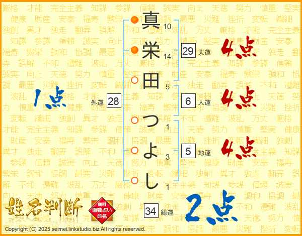 真(10画)栄(14画)田(5画) つ(1画)よ(3画)し(1画)