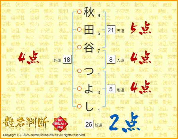 秋(9画)田(5画)谷(7画) つ(1画)よ(3画)し(1画)