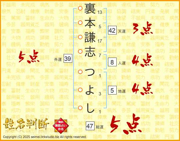 裏(13画)本(5画)謙(17画)志(7画) つ(1画)よ(3画)し(1画)