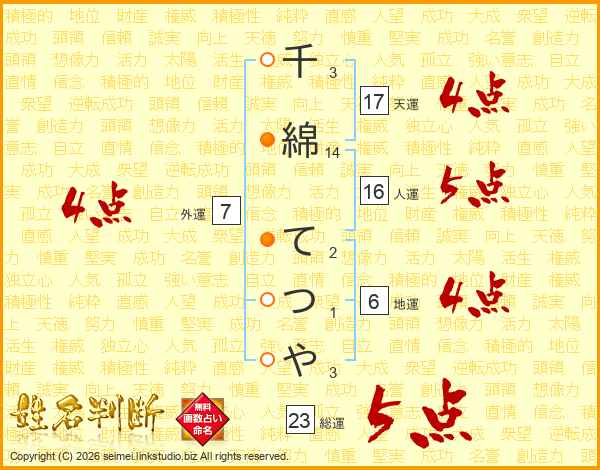 千綿てつやさんの総運は23画の5点!